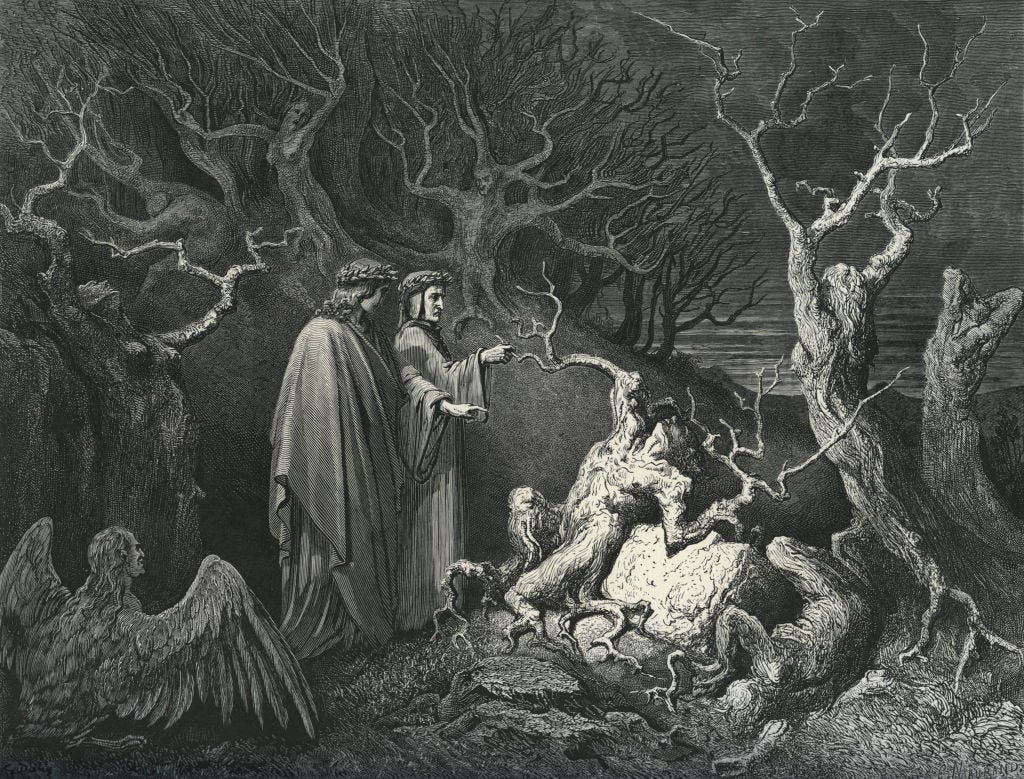 Dante devoted his life to the composition of “Inferno”, Purgatorio”, and “Paradiso” — the volumes comprising The Divine Comedy — after he was exiled from his native Florence on trumped-up corruption charges. He wrote more than 700 years ago, during the late medieval period–a period of extreme political turmoil–and in his allegorical journey, each of the nine circles represents a different sin and their corresponding punishments, while exploring themes of morality, justice, and the human condition. But it wasn’t all hellfire and damnation, Young says. In his estimation, Dante also had a wicked sense of humor, and some of the poems in the cycle also play with that, like this excerpt from “Ledge”: