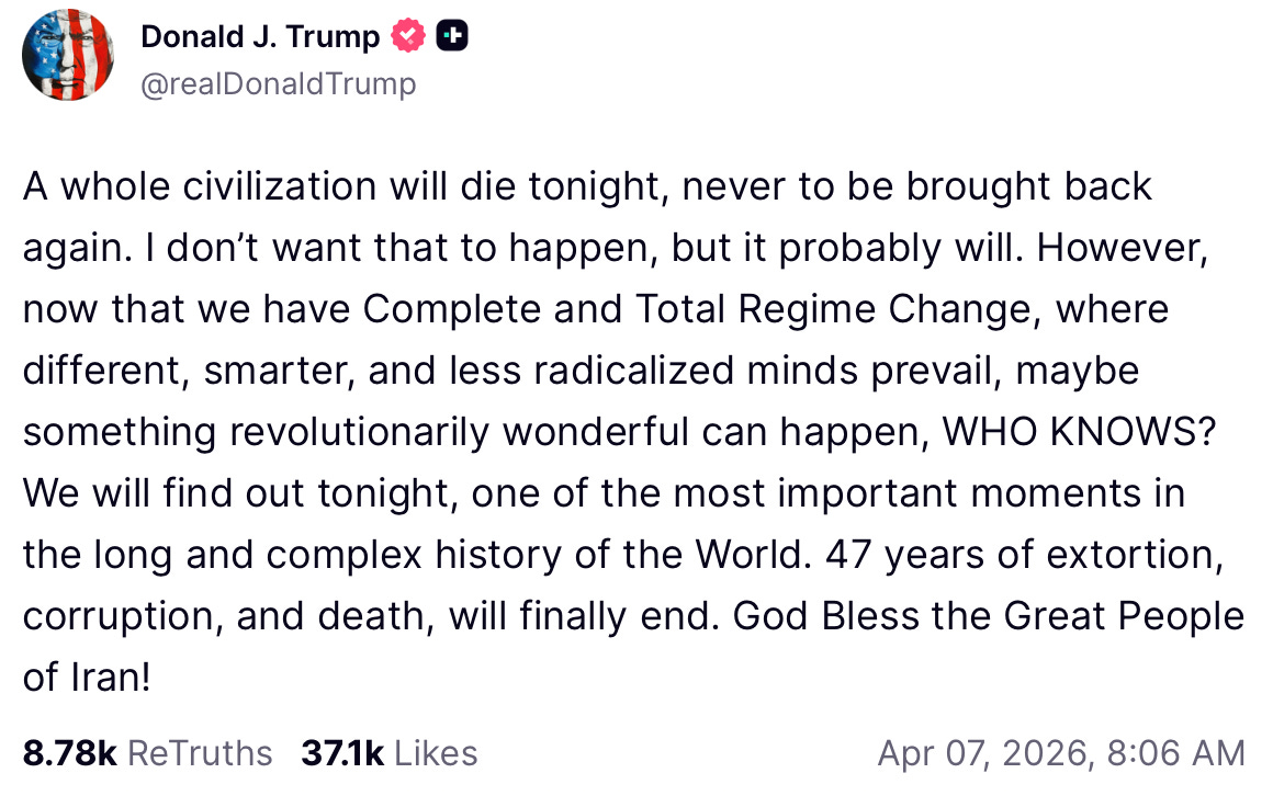 This morning, President Trump published one of the worst sentences ever verbalized by an American head of state. “A whole civilization will die tonight, never to be brought back again,” he posted. And from there the statement continued: