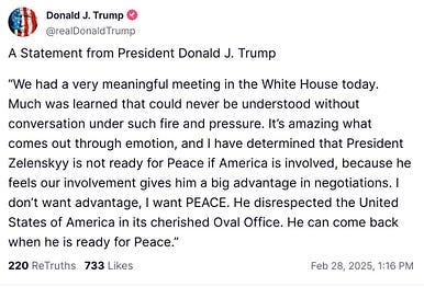 We talked to Wertheim about the shift from a U.S.-dominated post-Cold War international order to a more multipolar world, the risky legacy that Democratic foreign policy orthodoxy has left us with, and Trump’s attitude toward the international order: a cartoon imperialism based on the notion that transgressive things are good, creating a new narrative that overturns the story Joe Biden was telling outweighs the truth, and anything is worth saying if it will help him get what he wants out of the next transaction. And understanding that is key to cutting through the Trumpian bluster that overwhelmed Zelensky today, and that is likely to define the negotiations to come.