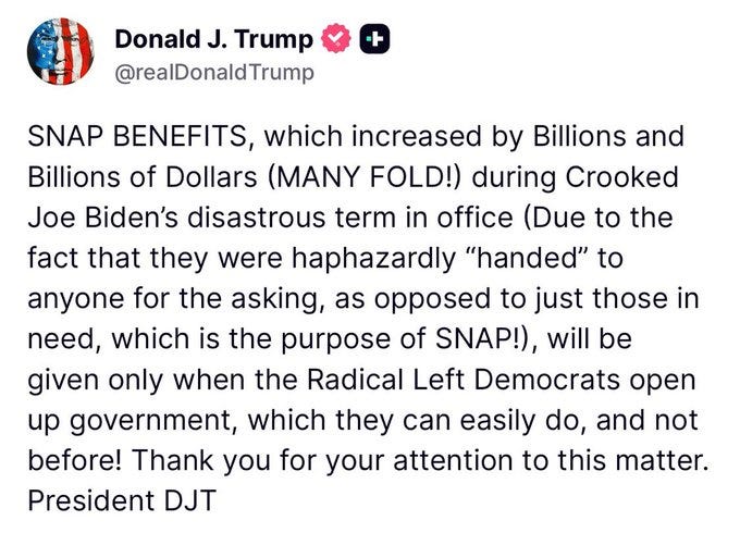 This week, as the shutdown officially became the longest in American history, the U.S. Department of Agriculture announced it would, after all, tap emergency accounts to partially fund SNAP benefits through November. Donald Trump objected, of course — who were these welfare queens anyway, to deserve a handout? Just bargaining chips in his war with the Democrats.