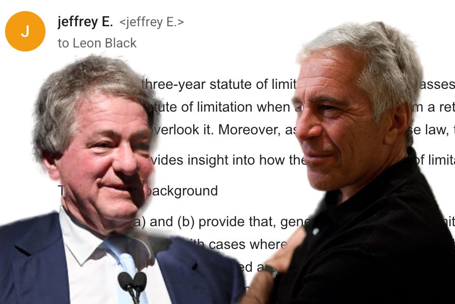A notable fact about the Epstein-Black emails is that many, but not all, were sent by Epstein directly to Black, via his assistant. Though Black was a billionaire with lots of people working for him, these were evidently things he had to think about and decide himself. This was what his brain had to be focused on. This was a mental load he accepted, because it was a priority.